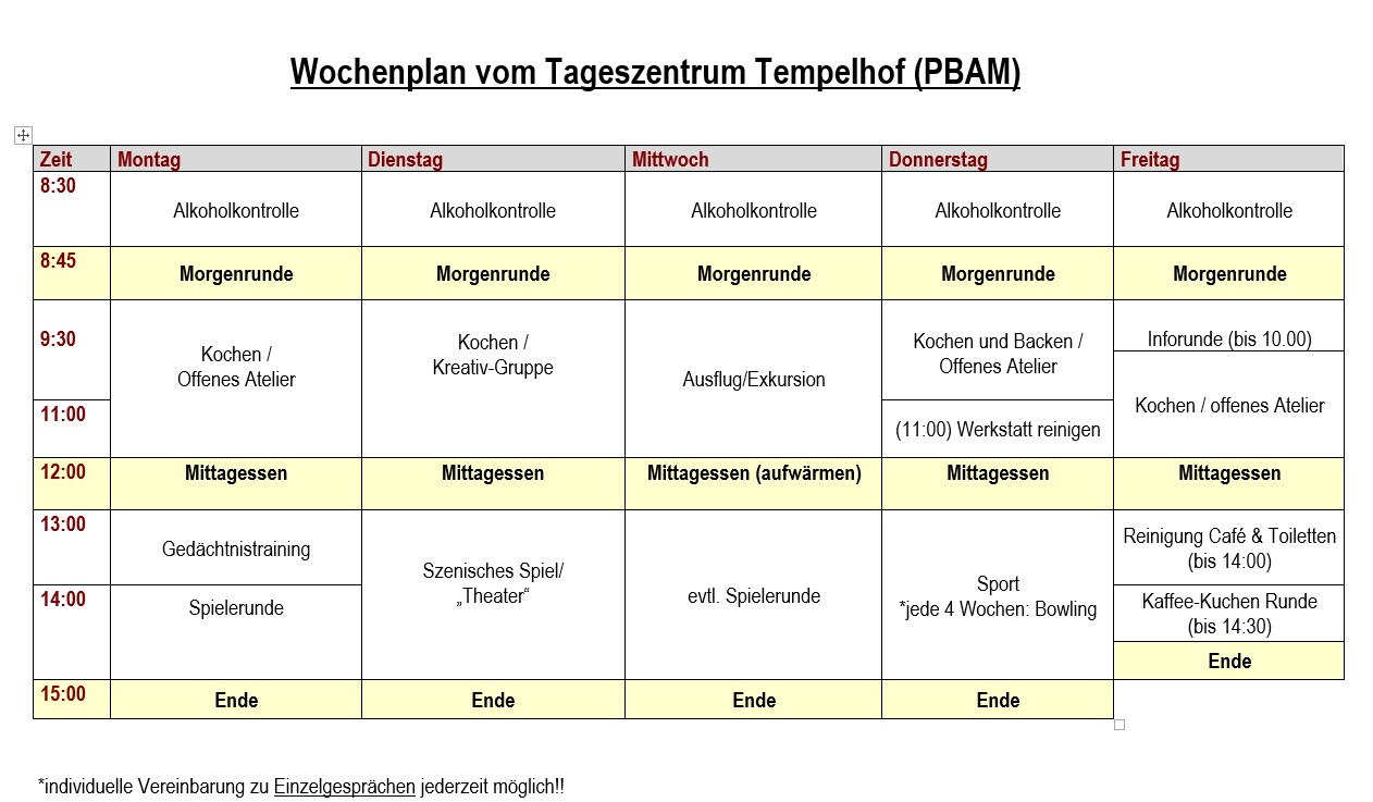Es steht wöchentlich eine Gesprächsgruppe an, in welcher von den Teilnehmenden gewünschte Themen besprochen werden. Die Gruppe wird von einer Fachkraft angeleitet und dient dazu, Austausch zu schaffen, wichtige Themen im geschützten Rahmen zu teilen und auf neue Erkentnisse/Gedanken zu kommen. Des weiteren gibt es auch eine Kreativ-Gruppe, bei welcher in einem gemeintschaftlichen Rahmen kreativ gearbeitet wird. Freitags findet eine Abschlussrunde mit Kaffee & Kuchen statt, die Option steht jedem/er offen die persönlichen Pläne für das Wochenende anzusprechen.